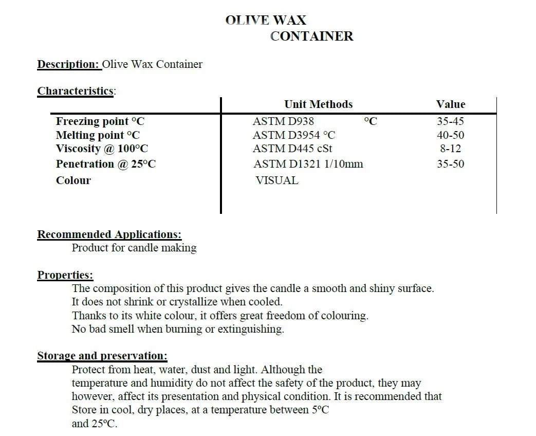 Cera Olive Extra Bianca per CONTENITORI. Nuova produzione