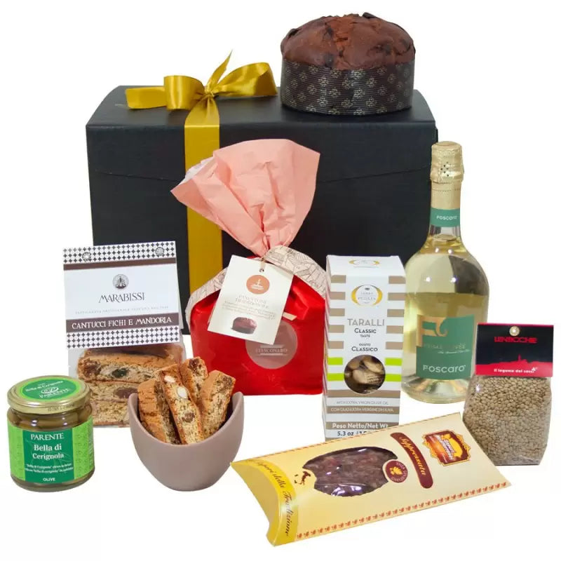 Momenti Golosi è composta da una elegantissima scatola in cartone e nastro in raso con paglietta contenente: