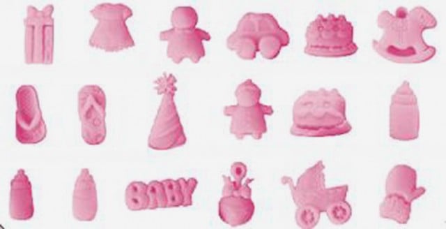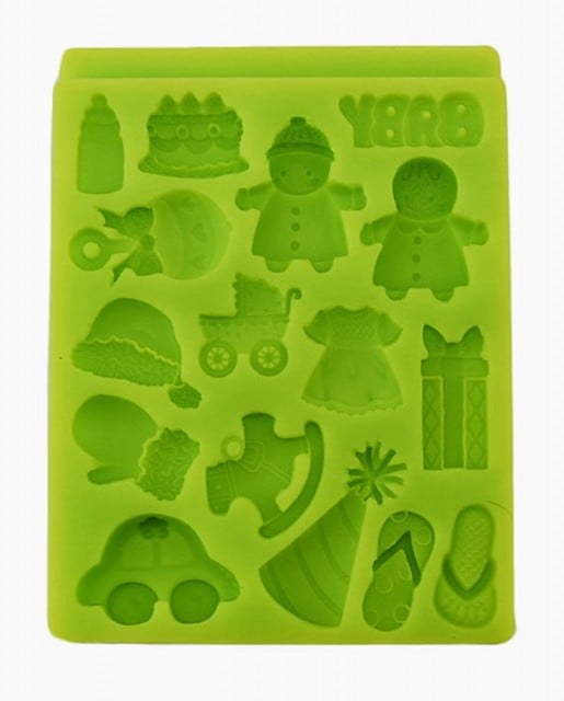 Questo stampo in silicone permette di creare 18 diversi disegni con la pasta di zucchero, con tema fanciulli.Lo stampo contiene: 2 bimbi biberon torta scritta "baby" sonaglino carrozzina vestitino femminile pacco regalo ciabattine cappello party macchinina cavallo a dondolo berretto guanto da neve. Dimensione delle formine: da 1,5 a 3,5 cm.Dimensione dello stampo: 10 x 7,5 cm