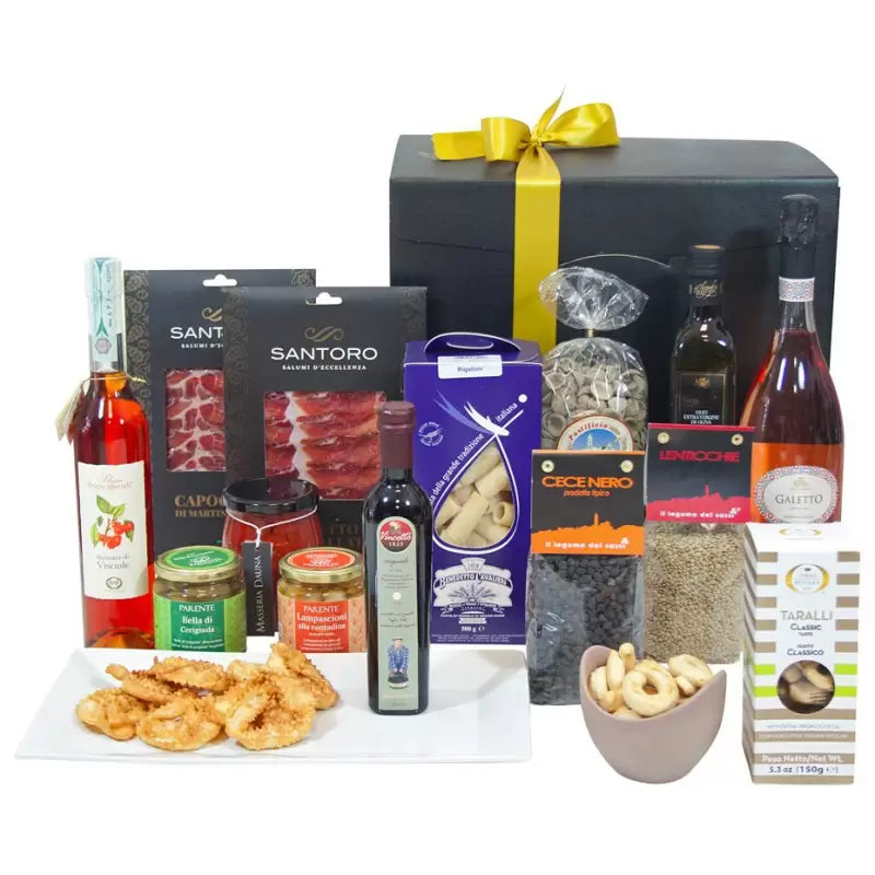 Elegante scatola in cartone (riutilizzabile) rifinita con nastro e fiocco in raso contenente 15 prodotti tipici pugliesi di altissima qualità.