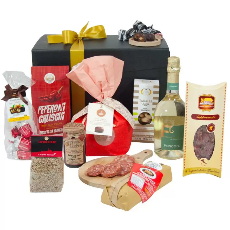 Tradizioni di Festa è composta da una elegantissima scatola in cartone e nastro in raso con paglietta contenente: