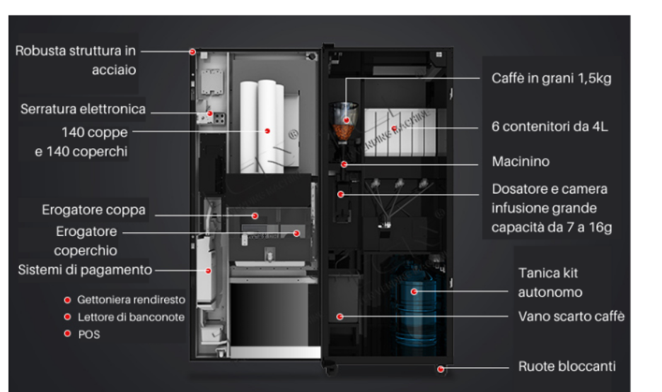 Optional: Gettoniera rendiresto, lettore di banconote, POS, box per invio alla agenzia delle entrate