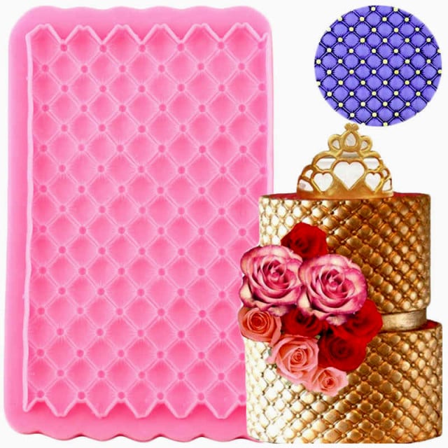 Stampo in Silicone per ricreare l'effetto Trapunta o Diamante, una serie di rombi caratteristici da imprimere sulla torta in pasta di zucchero e da impreziosire anche con diamanti di zucchero o decorazioni varie.Cod: 4.59/23. Dimensioni: 11 x 18 cm.
