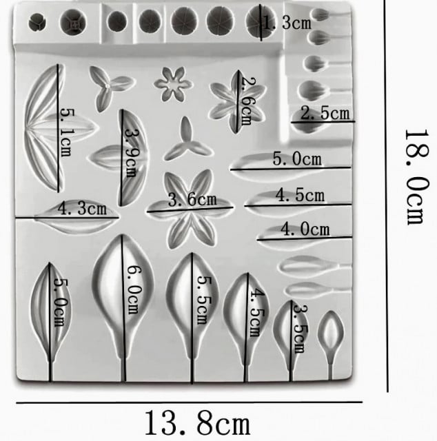 Crea cinque stili di piante :Cucchiaio Foglia: foglia più piccola 23 mm x 11 mm, foglia più grande 52 mm x 25 mm. Allungata: foglia più piccola 20 mm x 7 mm , foglia più grande 33 mm x 22 mm A punta: foglia più piccola 6 mm x 4 mm, foglia più grande 41 mm x 17 mm Filo di perle : perla più piccola Ø8mm, perla più grande Ø13mm Drop Pearls: perla più piccola 7mm x 5mm, perla più grande 16mm x 10mm. Lo stampo è facile da usare e può essere utilizzato con pasta di zucchero, pasta di gomma, pasta per modellare, marzapane, cioccolato, caramelle e zucchero bollito. Inoltre lo stampo può essere usato per progetti di bricolage. Puoi usarlo anche con porcellana a caldo, pasta di sale, argilla che si essica all'aria e polvere per goffratura. Modo d'uso: spingere il fondant nello stampo senza riempirlo eccessivamente. Eliminare il fondant in eccesso così da vederne il bordo.Girare ed estrarre la forma condelicatezza. Spolverare leggermente con farina di mais per facilitare il rilascio.Lavare ed asciugare bene lo stampo prima dell'uso. Lo stampo è sicuro per il forno (fino ai 200°C/392°F) ed è adatto alla lavastoviglie.Dimensione: Vedi foto allegata. Cod: 7.86/22