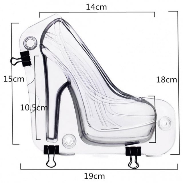 Stampo per cioccolato in policarbonato Rigido. Ottimo per uso professionale e domestico. Riutilizzabile.Il set è perfetto per la creazione di una Scarpa con tacco alto a Zeppa. Cod: 8.21/21. Dimensioni: 19 x h 18 cm